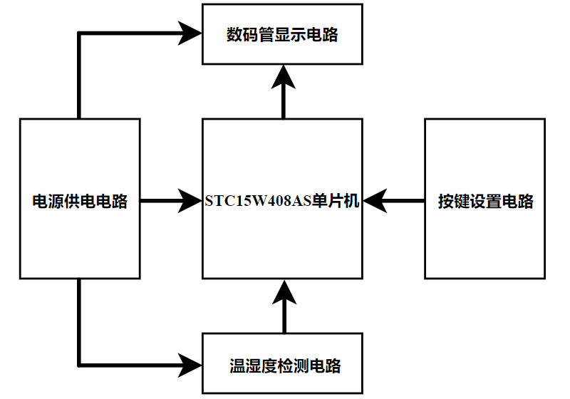 总体方案系统框图如图2-1所示,基于STC15W408AS单片机的数字显示温湿度计由电源供电电路、STC15W408AS单片机、温湿度检测电路、数码管显示电路和按键设置电路所组成。