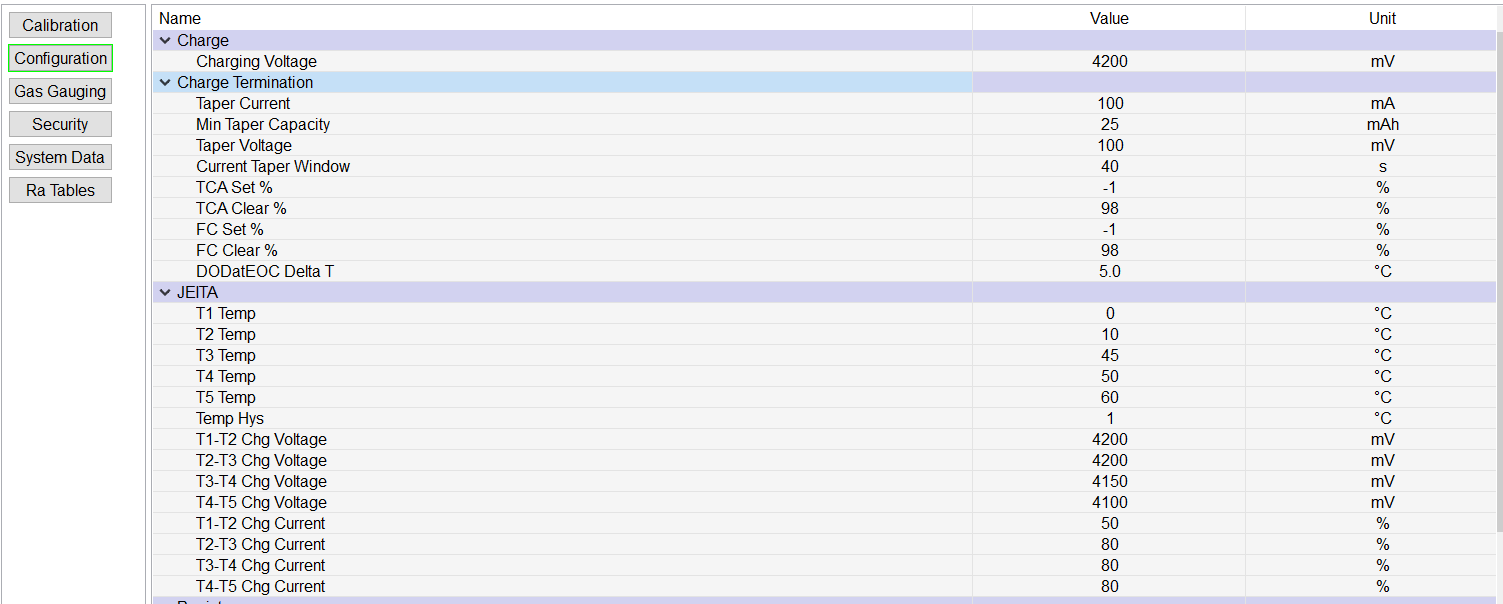(由于BQ27542仅为电量计,不带有电池保护功能,所以可供调节的选项不多)