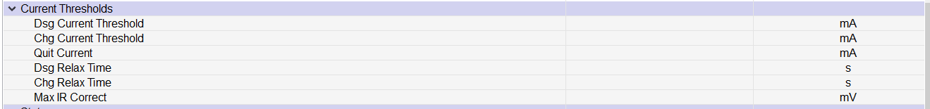 Data Memory->Gas Gauging(电量计)->Current Thresholds(电流阈值)选项: