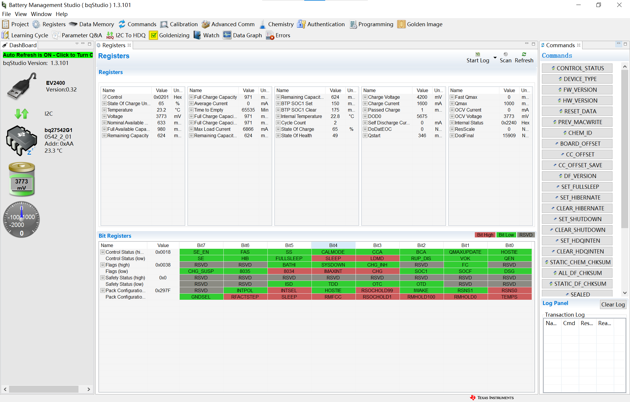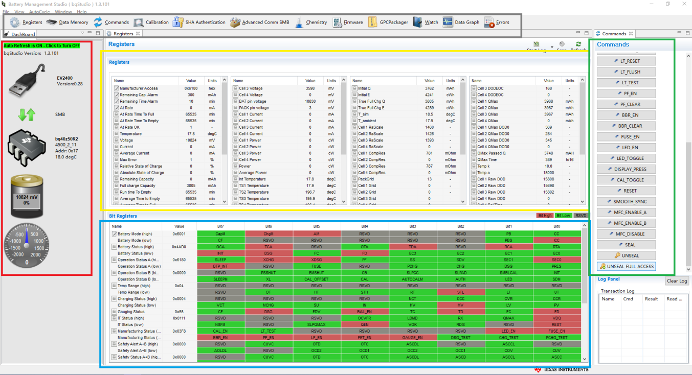 红色方框的是仪表盘,显示 bqStudio Version Version(软件版本)、通信盒类型和固件版本、电量计型号和固件版本、电池电压电流,在芯片图标的右下角还会显示是否处于Sleep mode(睡眠图标亮起)、是否处于Sealed mode (锁形图标亮起)。