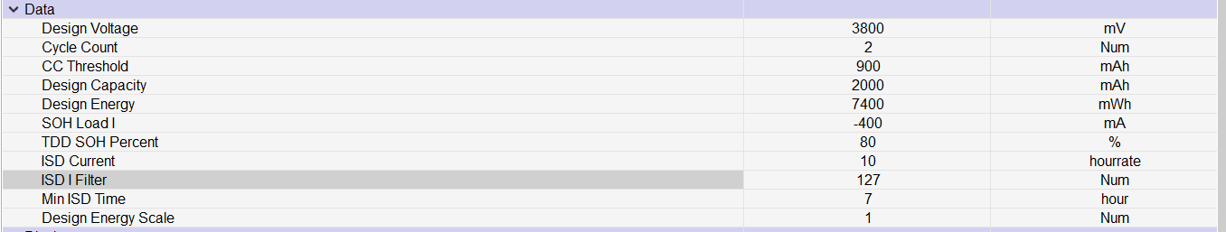 Design Energy Scale (设计能量比例):选择一组数据闪存参数的比例和单位,其值可以是 1 或 10。对于大于 6 Ah 的电池容量,建议使用设计能量比例 = 10。