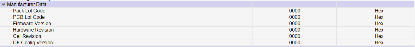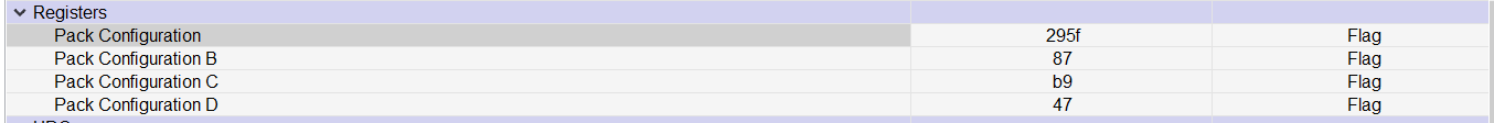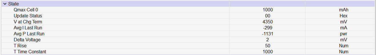 Qmax Cell 0(电芯0的最大容量):作为单节电池电量计,此为单节电芯的最大容量,为电量计经过校准,循环学习后的实时数据;若没有经过校准,则此为默认数据。(数据手册原文(有部分润色)):Qmax 包含电芯的最大化学容量,通过比较施加负载前后的电荷状态与通过的电荷量来确定。它们还对应于低排放速率下的容量,例如 C/20速率(即0.05C放电)。为了获得高精度,仪表在运行期间会定期更新该值。根据电池容量信息,应在 Qmax 字段中输入化学容量的初始值。Impedance Track 算法会更新并维护此值。在运行优化周期(即上方工具栏的Goldenizing(部分资料称之为Golden Learning))之前,将此值设置为电池单元数据表容量。运行优化周期并创建黄金设置后,将其设置为学习的值。默认值为 1000 mAh。