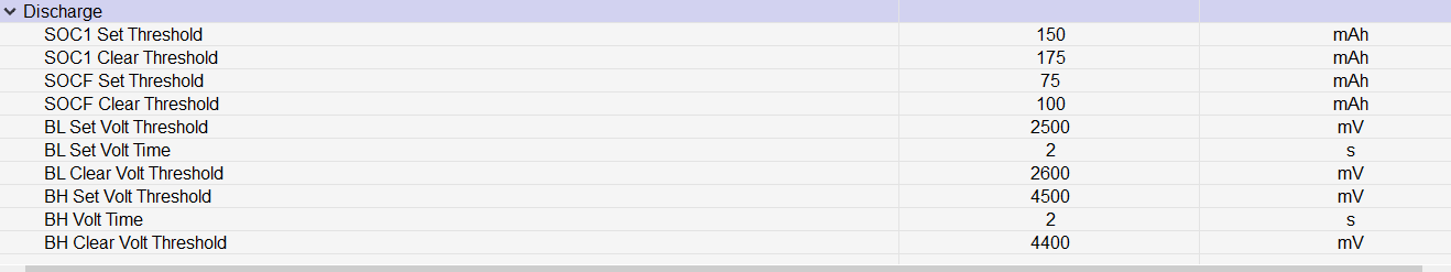 SOC1 Set Threshold(剩余电量低初始警告阈值):SOC1 Set Threshold 通常用作低电量预警告。如果 SOC1 Set Threshold 设置为 –1,则 [SOC1] 位将不起作用。SOC1 Set Threshold 通常设置为 Design Capacity 的 10%。SOC1 清除阈值通常设置为比 SOC1 设置阈值高 5%;即 Design Capacity 的 15%。