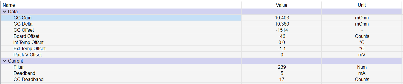 CC DeadBand(库仑计死区):创建一个滤波器窗口,低于该窗口时测得的库仑计数不会累积。任何低于此值的库仑计数都将被舍弃。对于 5 mΩ 的默认检流电阻值,此参数默认为 34 × 294 nV。根据给定的参考设计,CC Deadband =(Rold/Rnew)x 34 ,对检流电阻值的变化进行缩放。其中Rold为默认检流电阻值(5 mΩ),Rnew为新的检流电阻值。