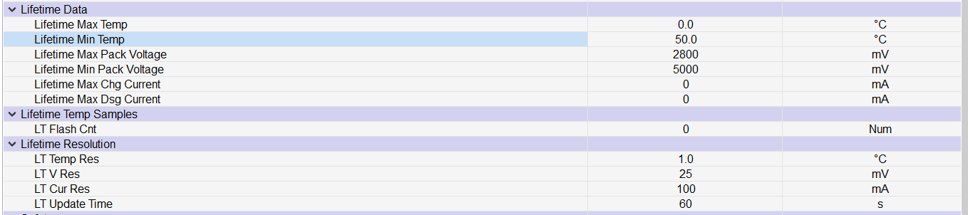 Termination Voltage Valid Time(放电截止电压有效时间):电池开路电压低于放电截止电压,且经过此时间后,即表示电池已经完全放空了电量;参数:RemainingCapacity() 与 StateOfCharge()将被设置为0,即电池完全没电。