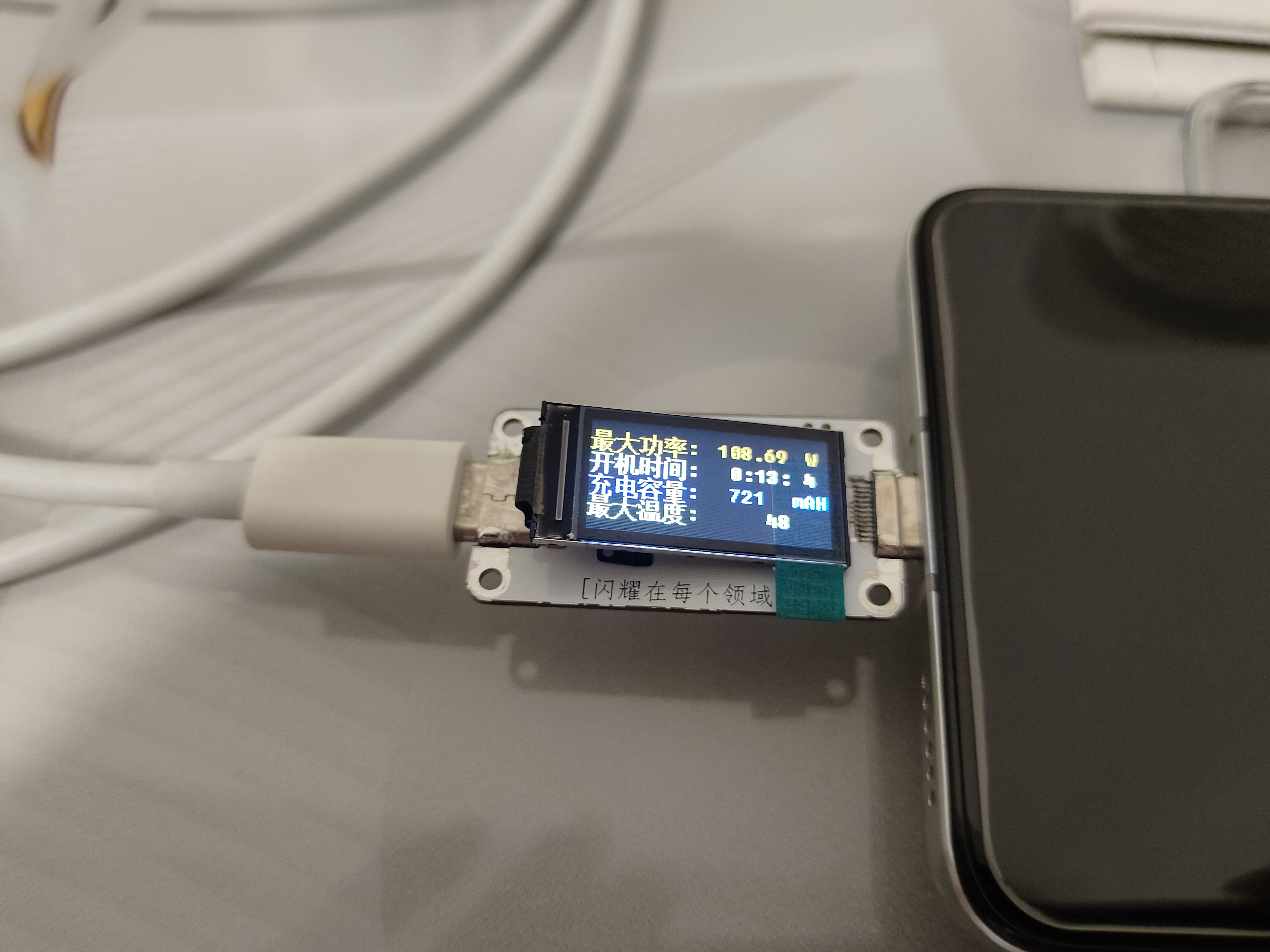 给手机充电,原厂120W快充充电头,此图中可以看出,充了13分钟,(NTC电阻在采样电阻处)采样电阻处最大温度48℃ ,充了720左右mah,最大功率为108.69W