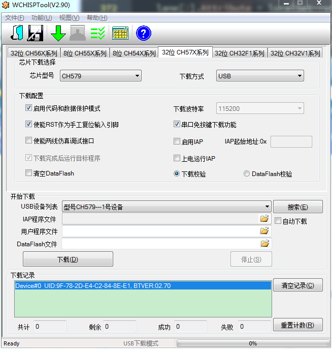 由于是个空芯片,在WCHISPTool里马上能识别到设备