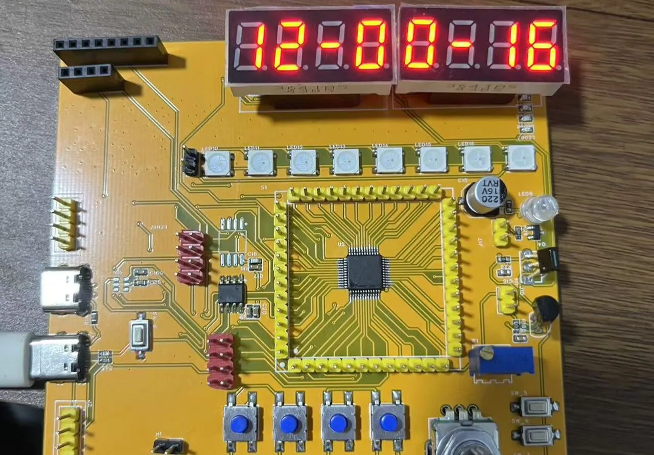 本工程以AI8051u这颗芯片为核心,设计了一款开发板,涵盖下载,串口,按键,数码管,流水灯,ws2812灯串,旋转编码器,红外发射接收电路,DS18B20温度传感器,蜂鸣器,OLED显示屏等。
