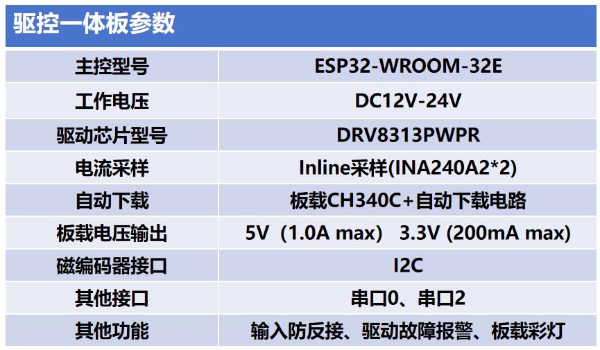 驱控一体板驱动板搭载ESP32-WROOM-32E模组,主频高达240MHz,性能强悍。具有蓝牙和WIFI,能够拓展出许多用法。无刷电机驱动芯片为DRV8313PWPR,峰值电流可达2.5A(@25°C@24V,长时间工作需小于1.5A)。采用Inline电流采样方案,使用INA240A2作为采样芯片,采样电阻为0.01欧姆,放大倍数50V/V。可采样电流范围-3.3A-3.3A。板上搭载CH340C芯片用于USB转串口通信以及下载程序。板载自动下载电路,下载过程无需手动复位。提供过流保护、短路保护、欠压闭锁和过温保护的LED指示功能