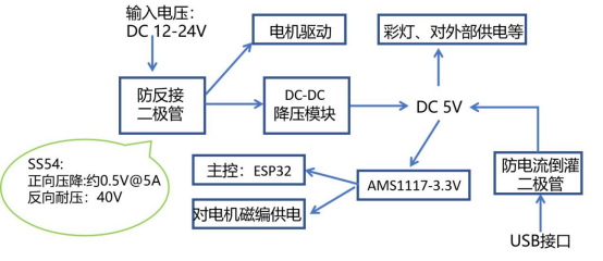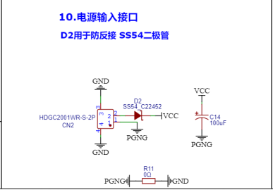 输入电压:DC 12-24V,D2用于防反接,D2可承受最大正向电流5A,但在满载状态下存在0.5V的压降,在小电流使用过程中约有0.3V的压降。VCC=输入电压-0.3V。