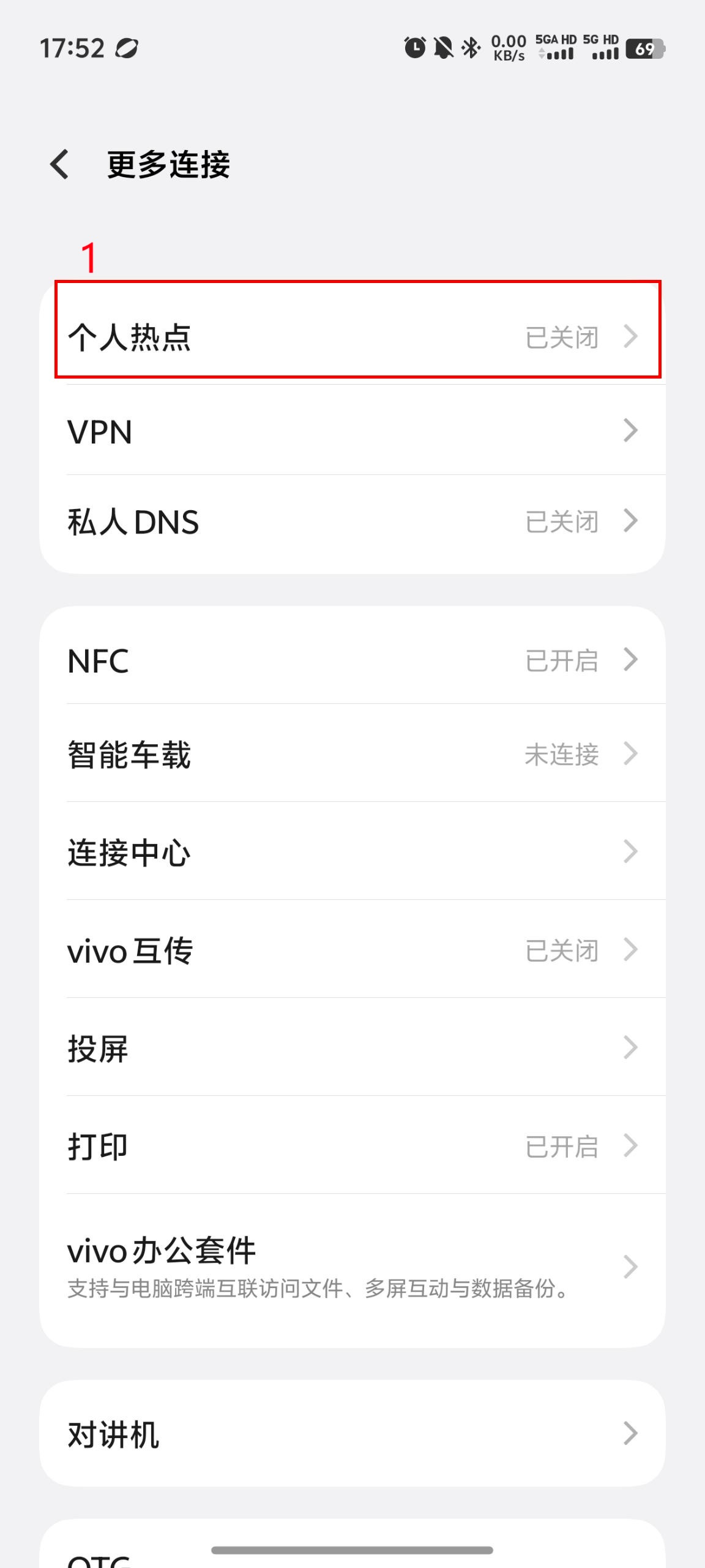 以下是Android手机的蓝牙设置界面,通过打开个人热点共享中的蓝牙共享网络功能。