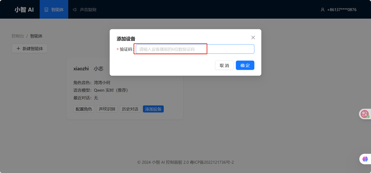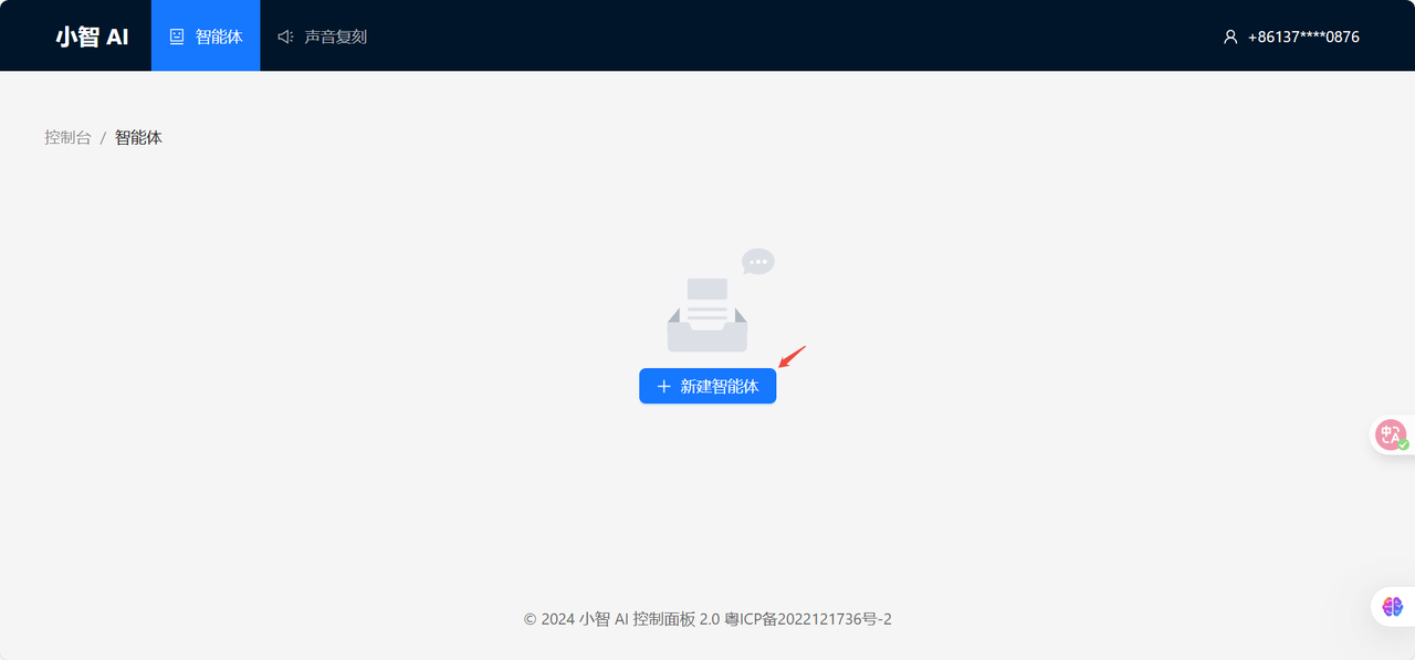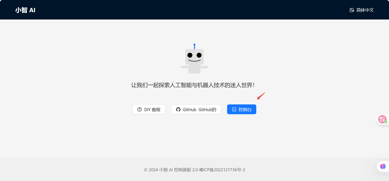 ⚠ 这个时候,打开浏览器,输入网址:https://xiaozhi.me。浏览器用手机或者电脑都可以。 进入小智 AI 的网页后,点击控制台,用手机号登录。