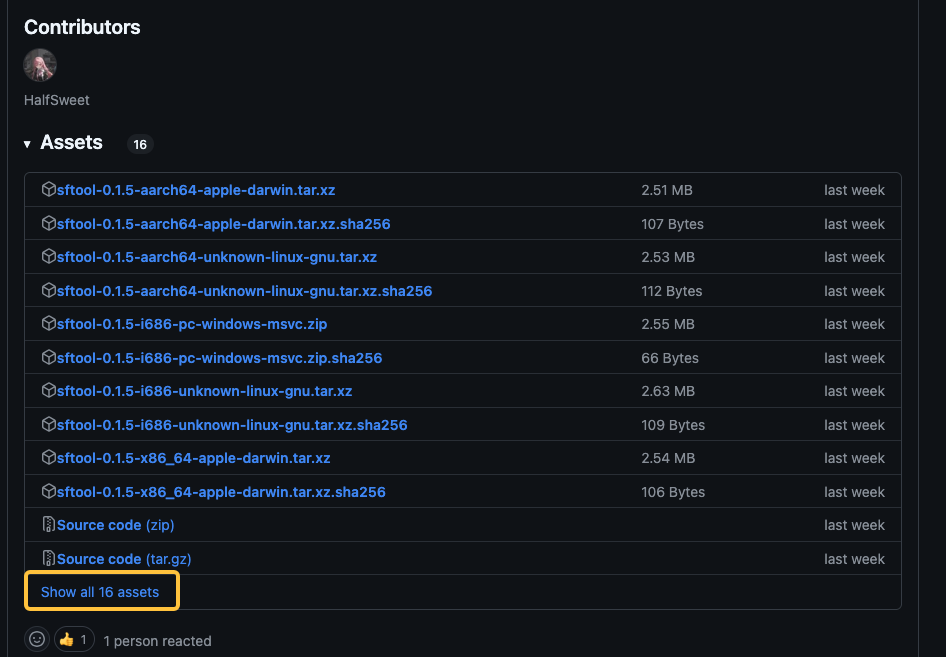 Windows 64bit操作系统,我们就应该选择 sftool-0.1.5-x86_64-pc-windows-msvc.zip这个版本,同样的,如果是Windows 32bit的版本,我们就应该选择sftool-0.1.5-i686-pc-windows-msvc.zip这个文件镜像下载。特别的,如果您找不到您系统的文件,那可能需要点击一下Show all assets按钮。