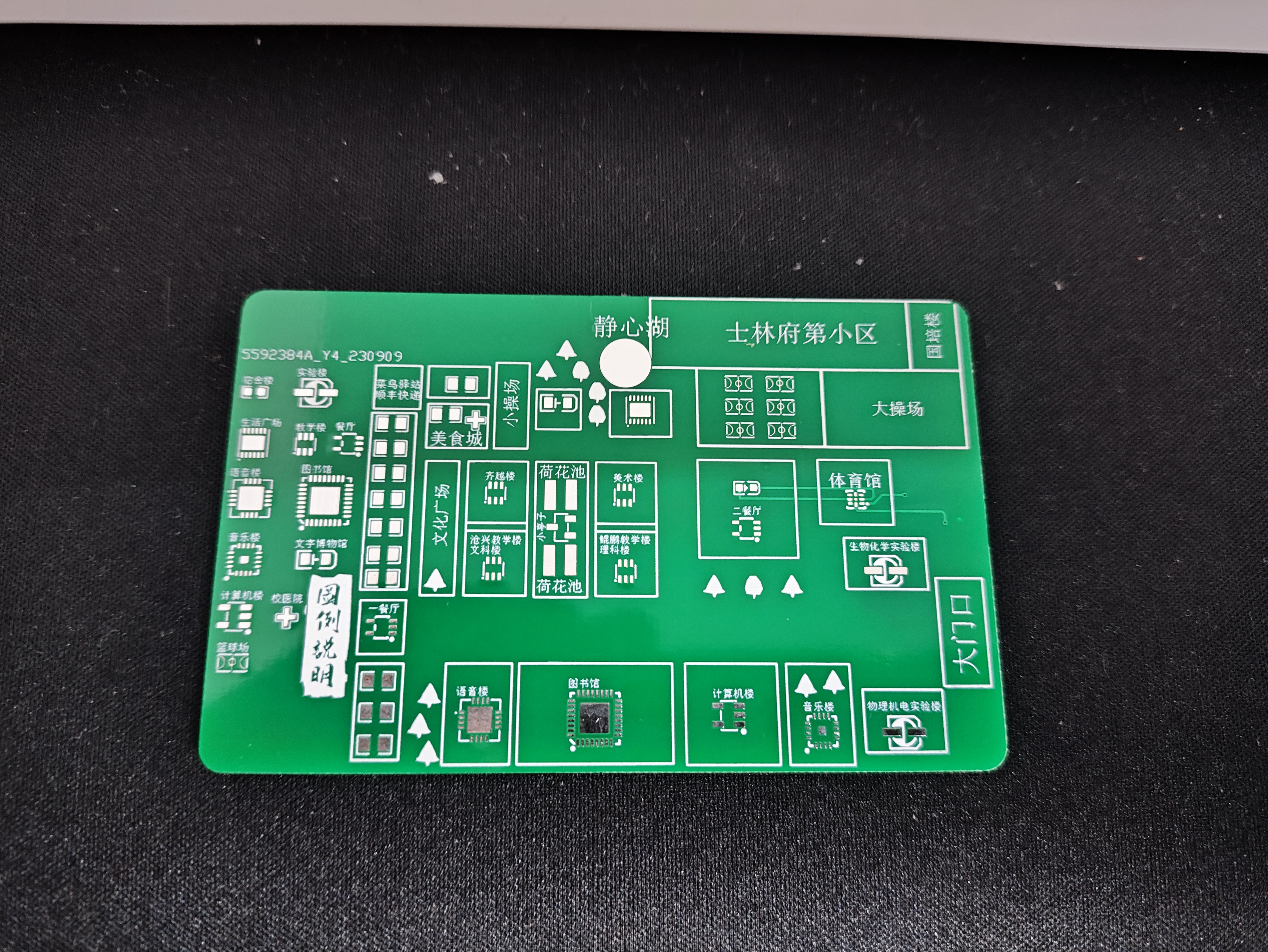 PCB1是用原件做的地图,反面是标志性建筑图书馆.PCB2是彩色丝印做的地图,反面是学校大门口.