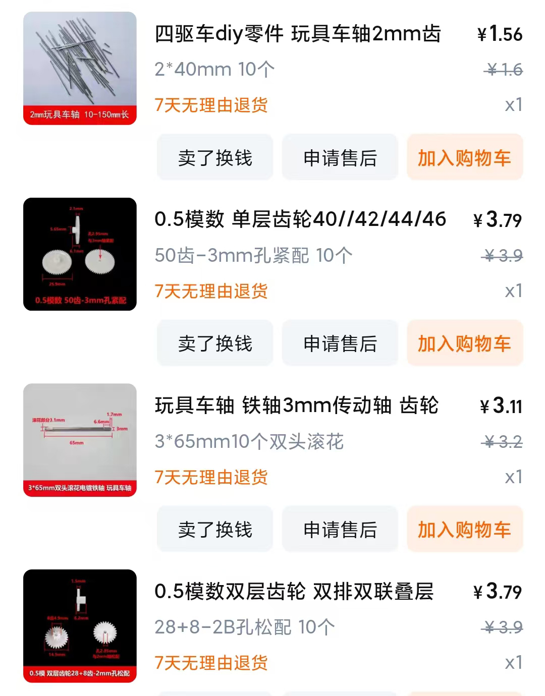 4.减速齿轮用2mm松配轴,离合器驱动齿轮为了防止打滑,用3mm紧配轴,并且需要把轴打磨成双面D的形状。