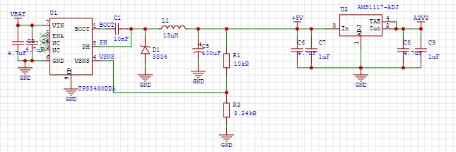 电源采用TPS5430DDA + AMS1117制造 5V和 3.3V电压,5v电源通过排针与梁山派相连。
