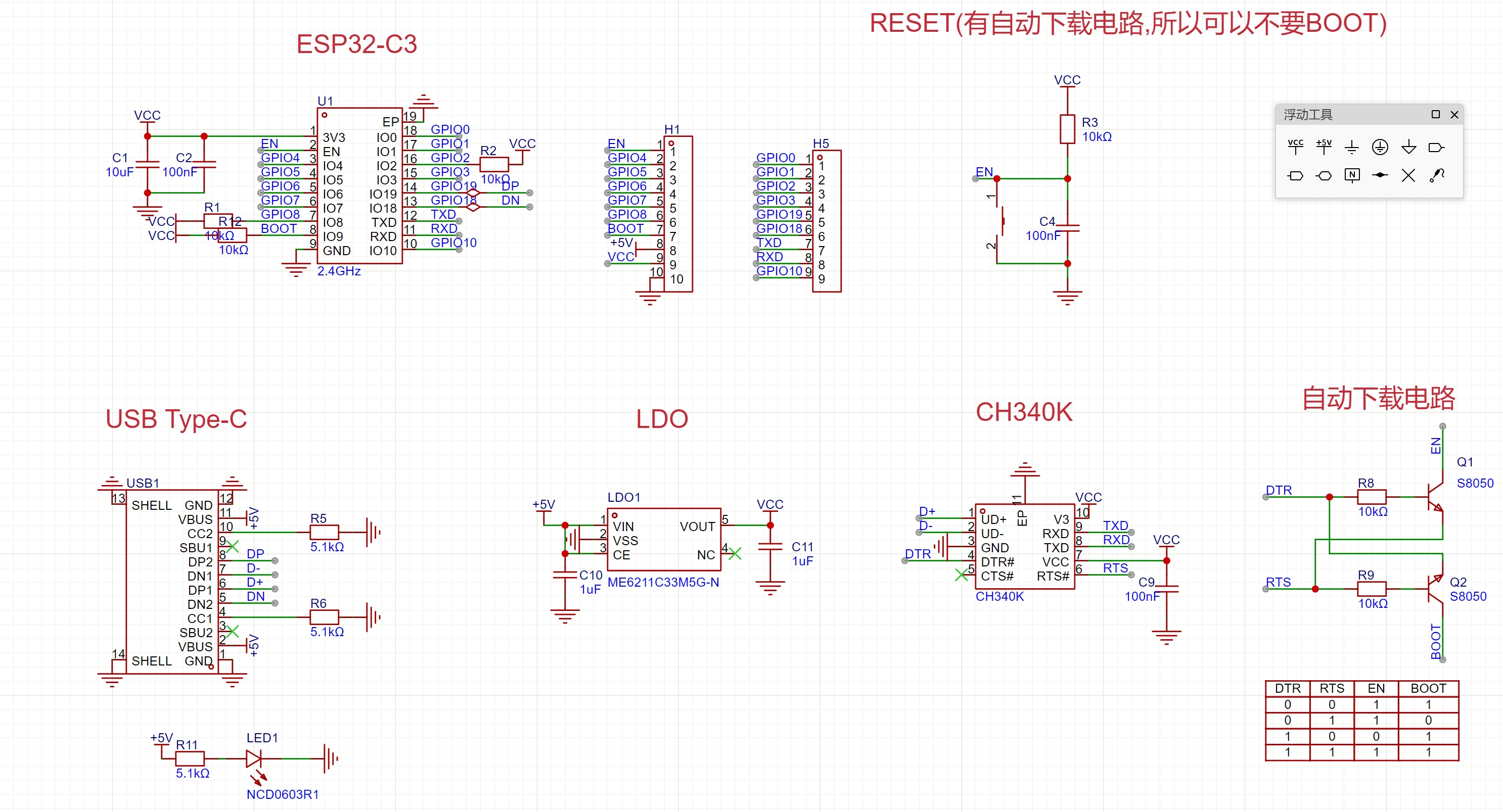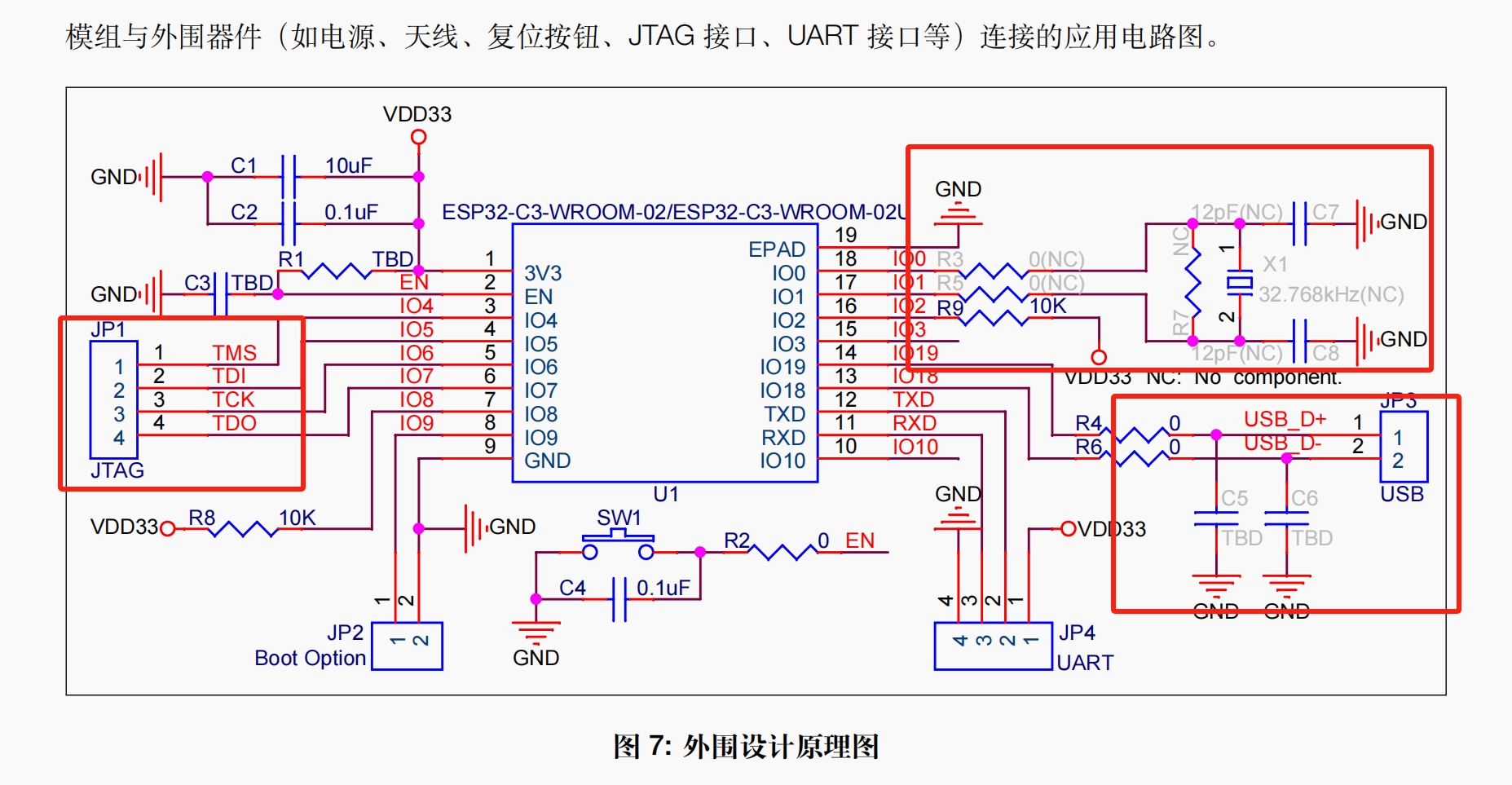 这里引脚要对应上,RXD要接到CH340的TXD,TXD要接到CH340的RXD。 如果我们需要ESP32C3WROOM支持USB下载的话,我们还需要把USB的D+和D-接到模组的D+和D-,这款核心板我是接上了,所以理论上是可以用USB下载的,但是我没试过,因为我用的VSCode不支持给ESP32用USB下载。 最后就是最小系统的外围电路了。