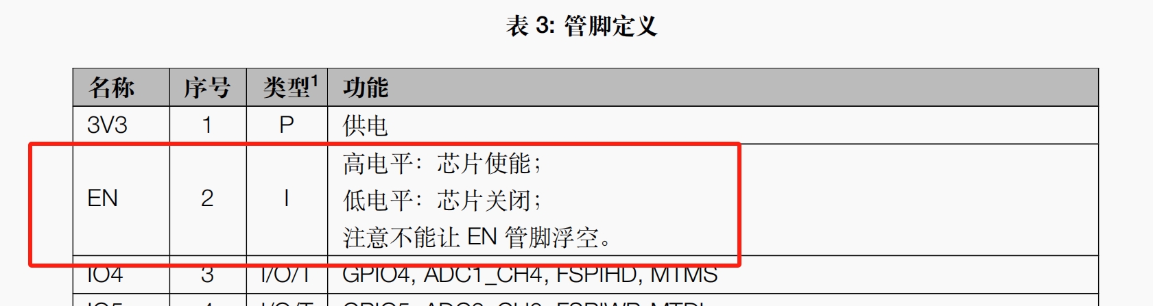我用的是02的自带板载天线的。 名字接下来是一个字母带一个数字。 H表示高温,模组最高工作温度是到105℃,N表示低温,模组最高工作温度是到85℃,我们选择N的就行,一般也不会让它工作在高温环境下。 最后一个数字表示的是Flash大小,4是4MB,8就是8MB。 具体选什么型号的都没关系,外围电路不会因此不同,大家根据自己的需求选择就行。 接下来是引脚,如果我们的模组(或者是芯片)用在实际应用上,那么我们在画板子的时候需要考虑引脚的功能,比如说ADC什么的是只有特定的引脚才能用的。 但我们核心板的话就没那么讲究了,把引脚全部接到排针上就行。 不过还是有几个地方需要注意一下。 第一个是EN引脚。