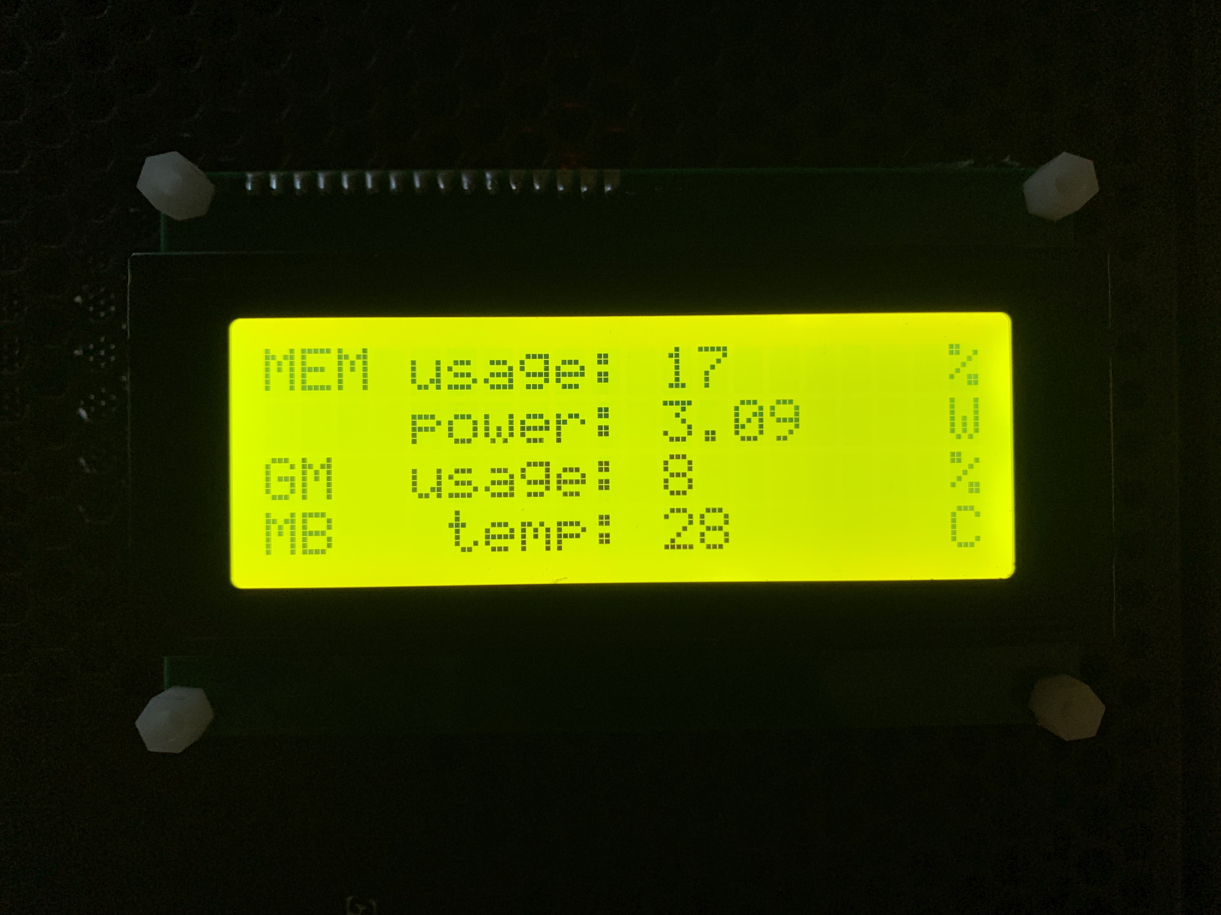 lcd.setCursor(0,2);lcd.print(" usage: ");lcd.setCursor(11,2);lcd.print(CPU_usage);lcd.setCursor(19,2);lcd.print("%");