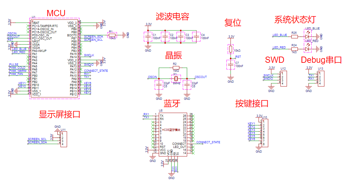 控制电路的原理图如图4所示,主要包括芯片外围电路、显示屏接口电路、蓝牙接口电路、按键接口电路和串口调试电路。控制核心采用常用的stm32f103c8t6芯片,也可用国产的HK32 f103c8t6芯片进行替代。