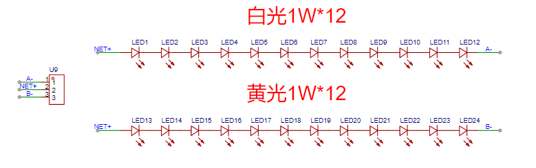 灯板电路采用24颗1W的LED灯珠进行设计,其中12颗为正白,12颗为暖白,单颗电压为6V。原理图如图10所示,电路板仿真图如图11(a)所示,电路板实物图如图11(b)所示。在设计灯板PCB时,应使正白和暖白LED均匀排列,且油墨颜色为白色。
