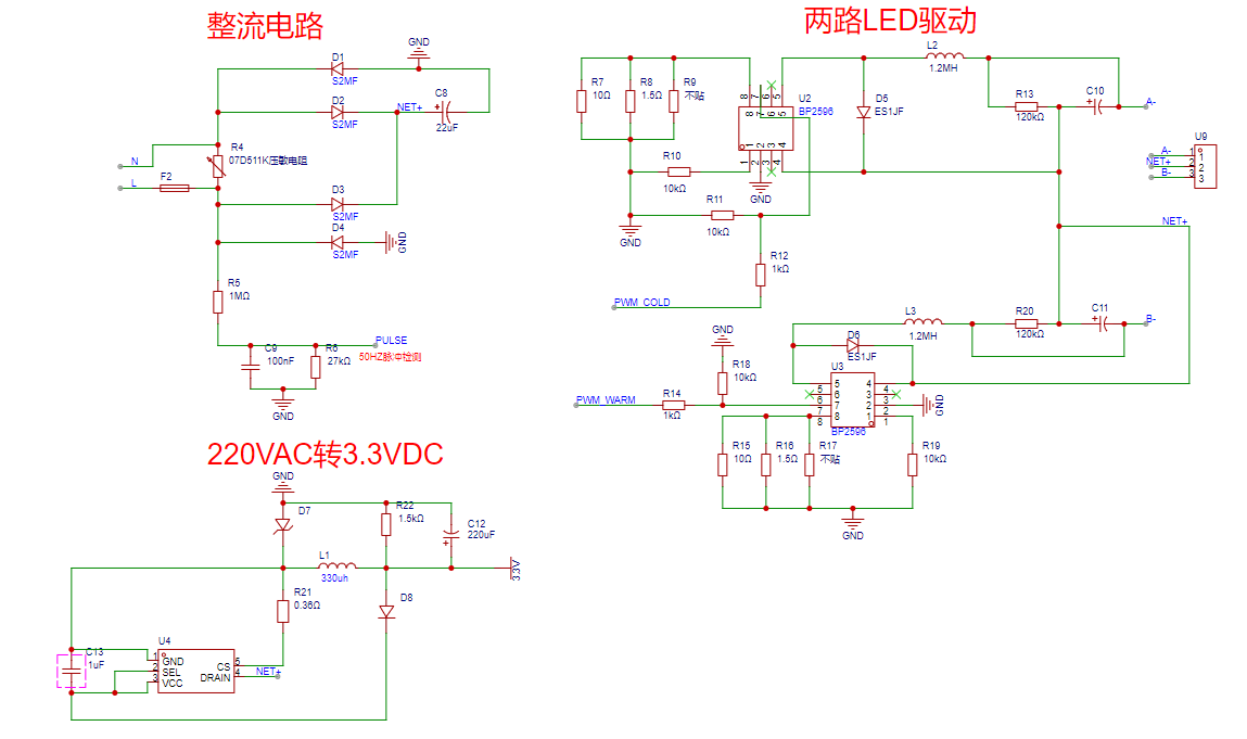 台灯电路的原理图如图5所示,主要包括整流电路、两路LED驱动电路和220V交流转3.3V直流电路。整流电路的核心器件为4个二极管,同时包含滤波电容,并通过阻容件引出一路50HZ的脉冲信号,控制芯片可通过检测该脉冲实现快速开关切换照明模式的功能。LED驱动的核心器件为BP2596芯片,产生3.3V直流的核心器件为BP2525芯片,3.3V用于控制电路供电。