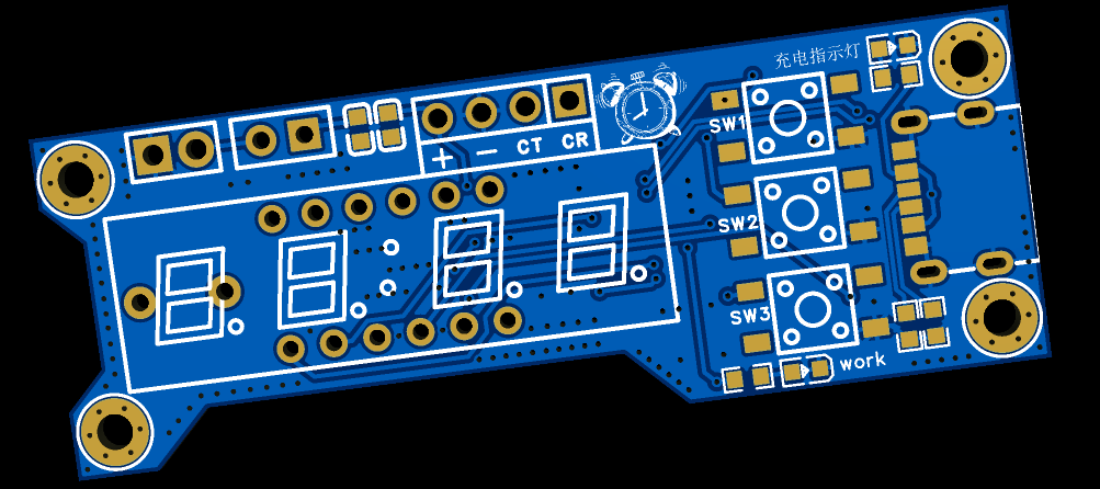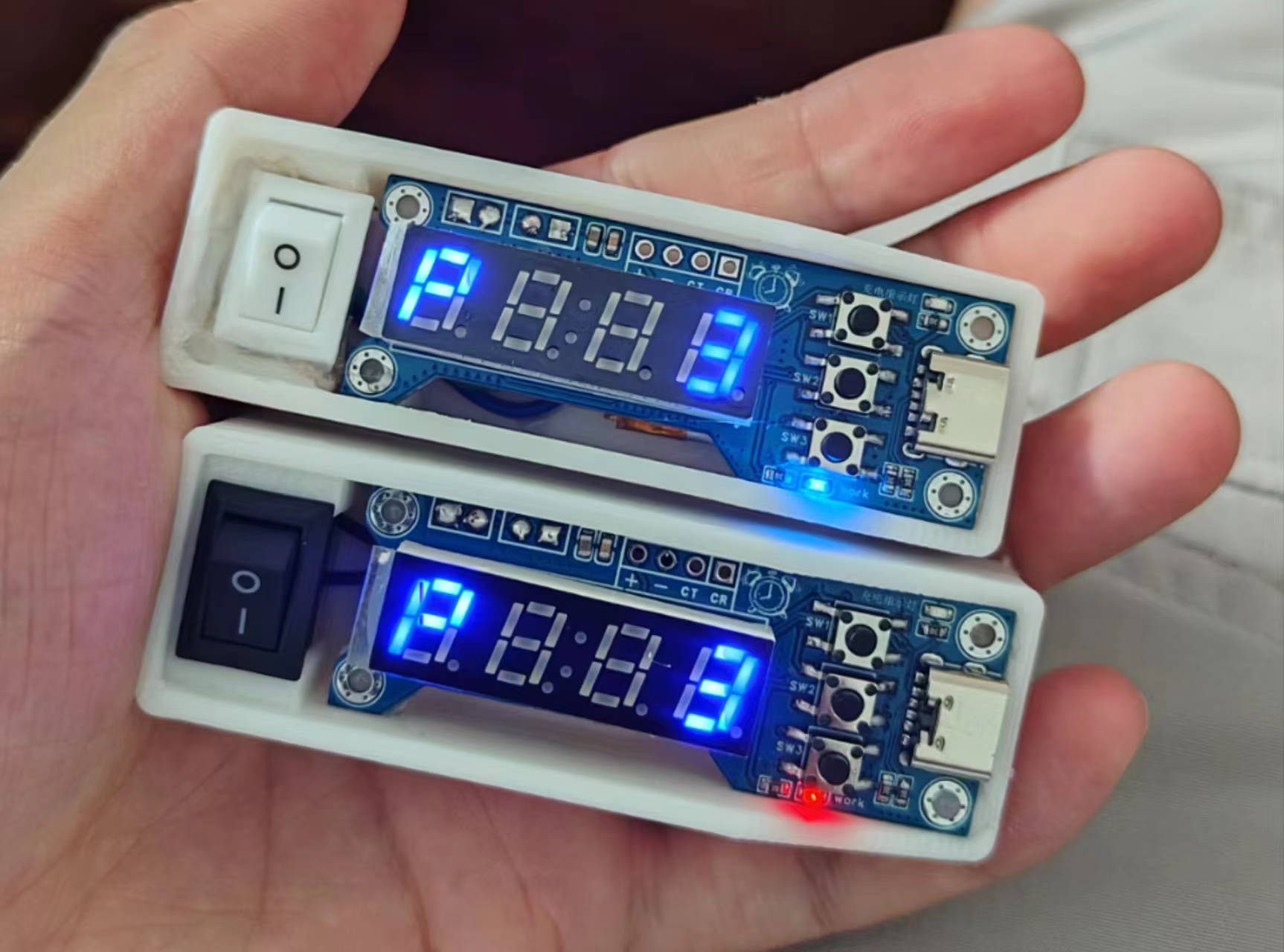 设备具有三个按键,分别实现了“数值加/减”和 “开始/停止计时”功能,按键位于数码管右侧,竖向排列。