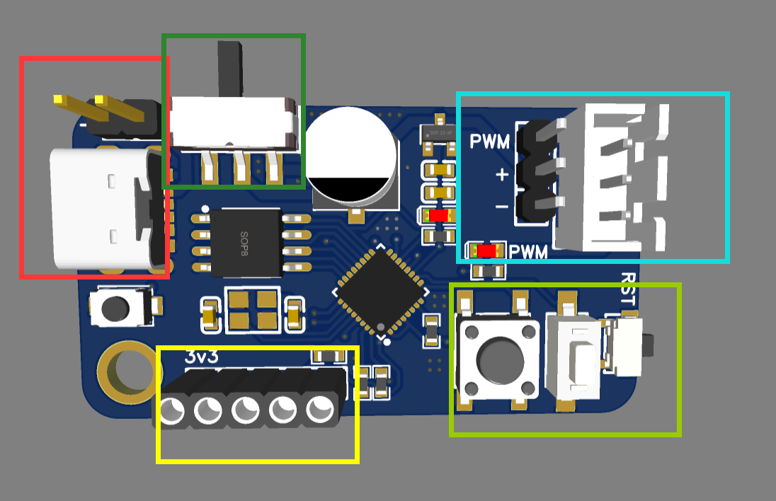 4.模块带有三个按键,如图右下角浅绿色框内所示,从左到右的前两个开关用于输出模式切换、最右侧按键用于重启在主控芯片,该按键连接在主控的RST引脚,具体使用请参考下文的使用方法。