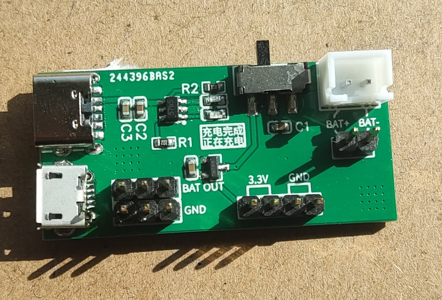 基于TP4057芯片制作的单节锂电池充电验证板,板载 Type-C、USB-A进行电源输入,带有3.3v稳压器,可以输出3.3V,带有充电完成和正在充电指示灯。