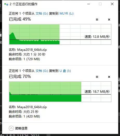 2.多口同时拷入文件测试(用金士顿3.0U盘测试):一个传输速度为12.8MB/S,一个传输速度为18.7MB/S