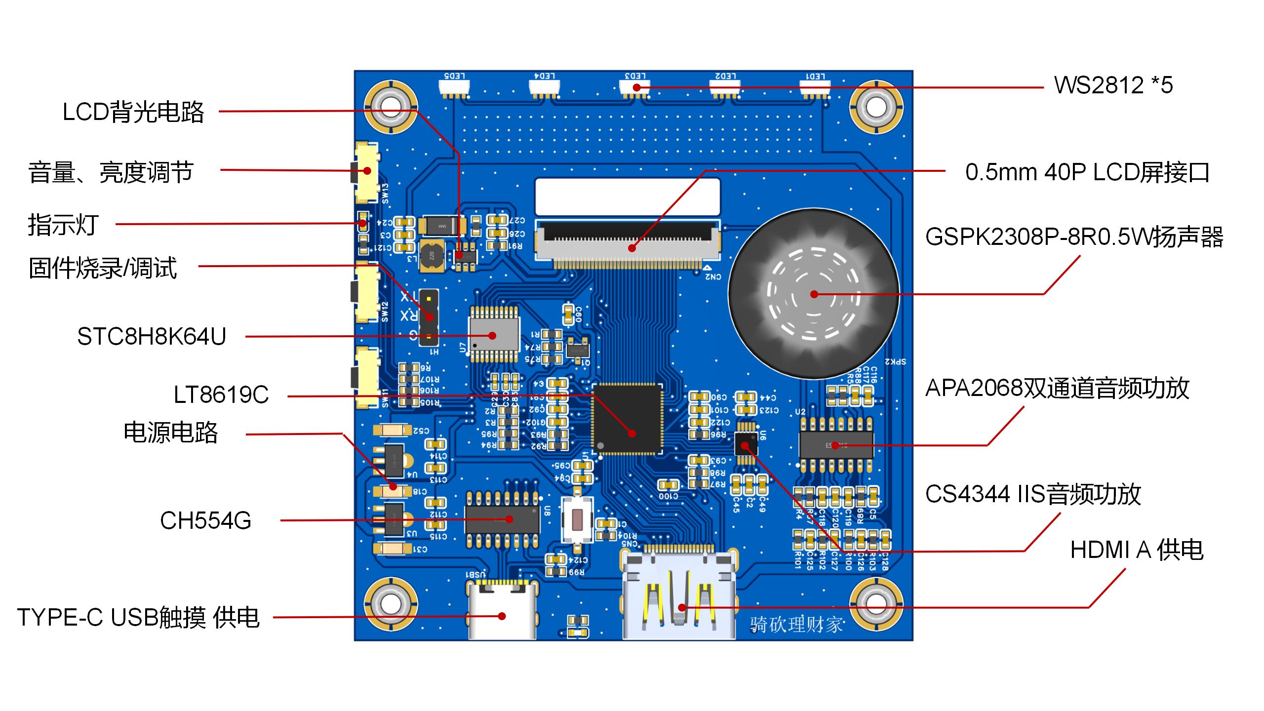 - 本模块目前验证了HDMI显示及音频、USB触摸这三个主要功能。WS2812灯珠和三个轻触按键电路未焊接测试,后面验证完成后补充RGB灯效、按键调亮度、音量等装饰性的功能。全部器件焊接是没有问题的。