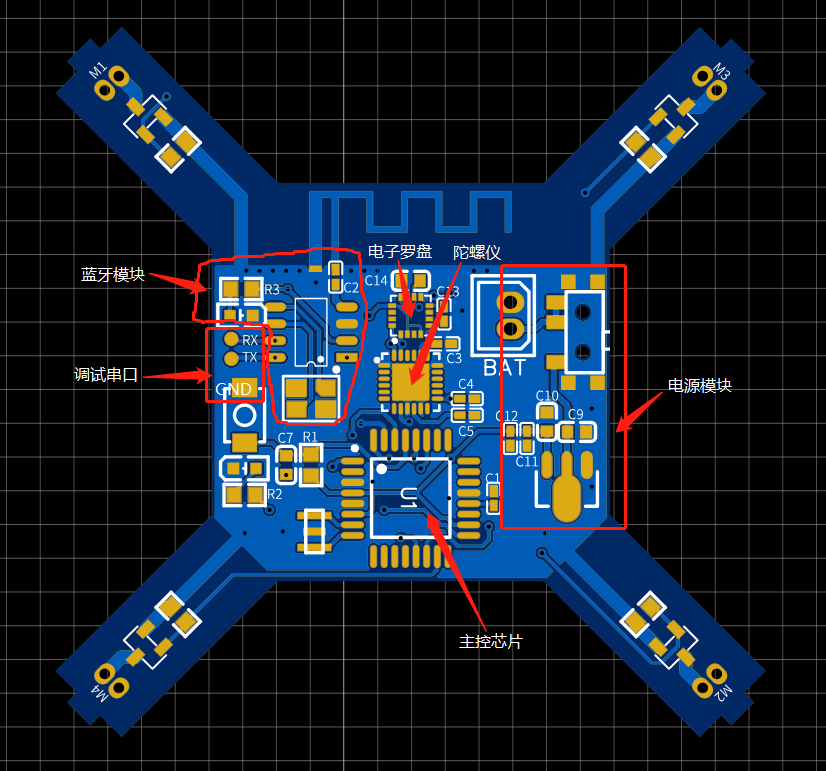 板子正面放置了飞控的大部分元件,主控Atmega328,陀螺仪MPU6050,电子罗盘HMC5883,串口蓝牙芯片KT6368A。