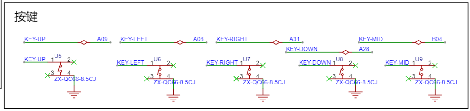 该电路为按键输入模块,设有 KEY - UP、KEY - LEFT、KEY - RIGHT、KEY - DOWN、KEY - MID 共 5 个独立按键(U5 - U9 均为 ZX - QC66 - 8.5CJ 型号 ),每个按键一端经对应标识线(如 KEY - UP 连 A09 等 )接控制器引脚,另一端接地;按键按下时,对应引脚电平会变化,可实现向上、向左、向右、向下、中间确认等输入功能,为系统提供人机交互的按键操作接口 。