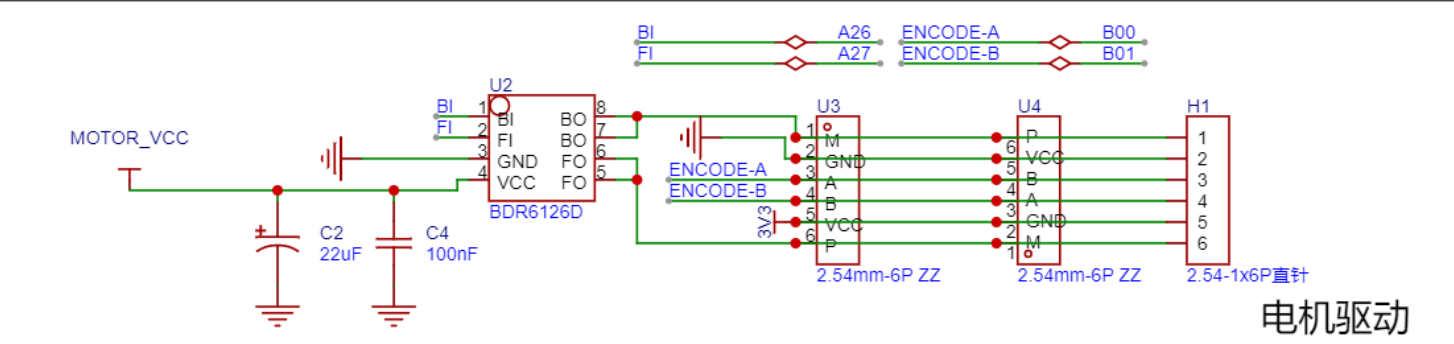 该电路围绕 BDR6126D(U2)构建电机驱动系统,MOTOR_VCC 为电路提供电源,经 C2(22μF)、C4(100nF)滤波后,为 BDR6126D 供电,其 BI、FI 引脚接收控制信号,BO、FO 引脚输出驱动信号;编码器信号 ENCODE - A、ENCODE - B 经 U3、U4(2.54mm - 6P ZZ)转接,通过 H1(2.54 - 1x6P 直针)与电机驱动关联,实现电机转速反馈与控制,保障电机按设定运行并反馈状态 。