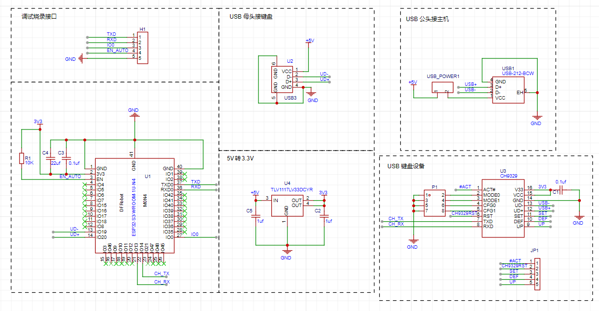 - 右下角是 Ch9329 芯片,它是一个 HID 转串口芯片,在这个设计中用于实现USB键盘的功能。