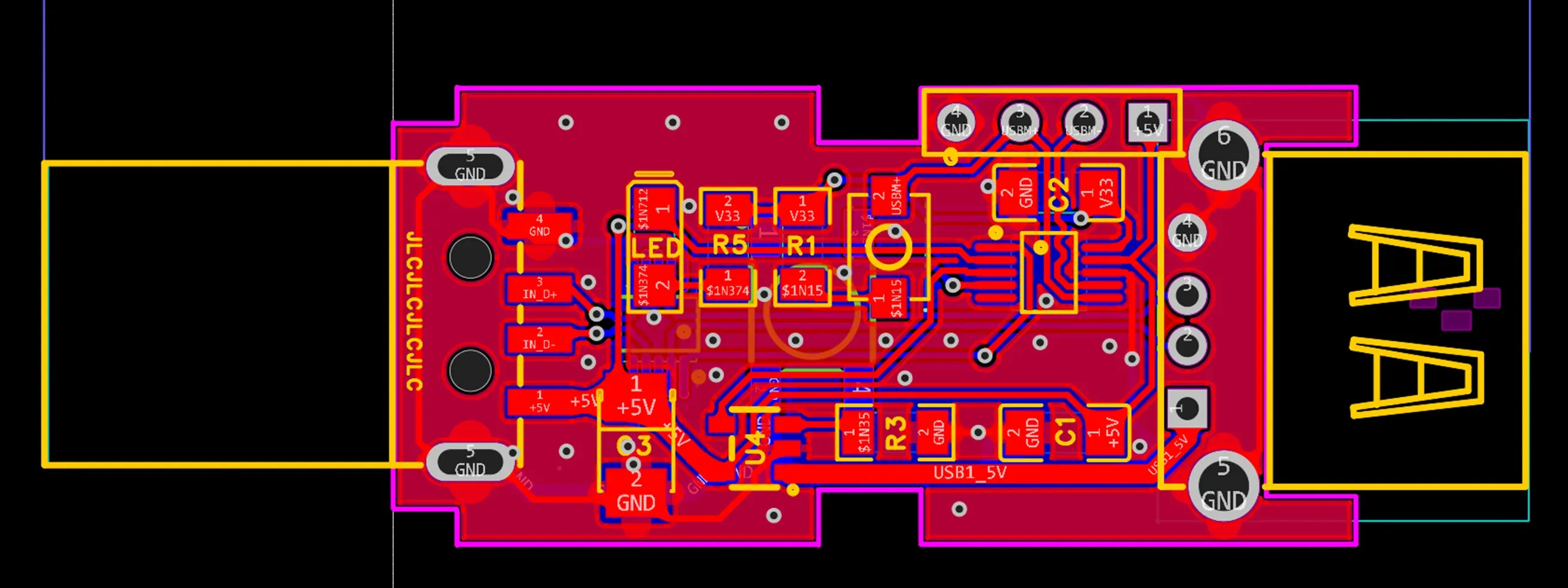 针对这种情况,这次设计了一个 USB 插拔装置,遇到问题的时候无需做插拔动作,而是通过按键一次自行完成一个插拔的模拟,这样可以方便使用。USB插拔动作可以分解为2步,插入时是先接通5V供电,然后接通D+/D-信号。如果仔细观察USB接头,可以发现USB D+/D- 引脚会比5V和GND 短一点,这样就能保证插入的时候是先接通供电,然后再接入信号的。这样可以避免插入时信号先于供电接通,电流直接倒灌到芯片中。类似的,拔出时,是先断开信号,然后再切断供电。
