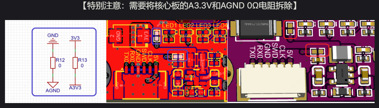 使用CJ431产生2.5V电压,作为单片机ADC基准源电压。此时应注意,梁山派的ADC基准源电压默认是3.3V,因此务必务必要拆除梁山派上对应的A3.3V AGND的0欧跳线电阻(去除原基准电路,切换到底板基准电路),不然最后测量得到的数据会出错,甚至会烧坏电路。