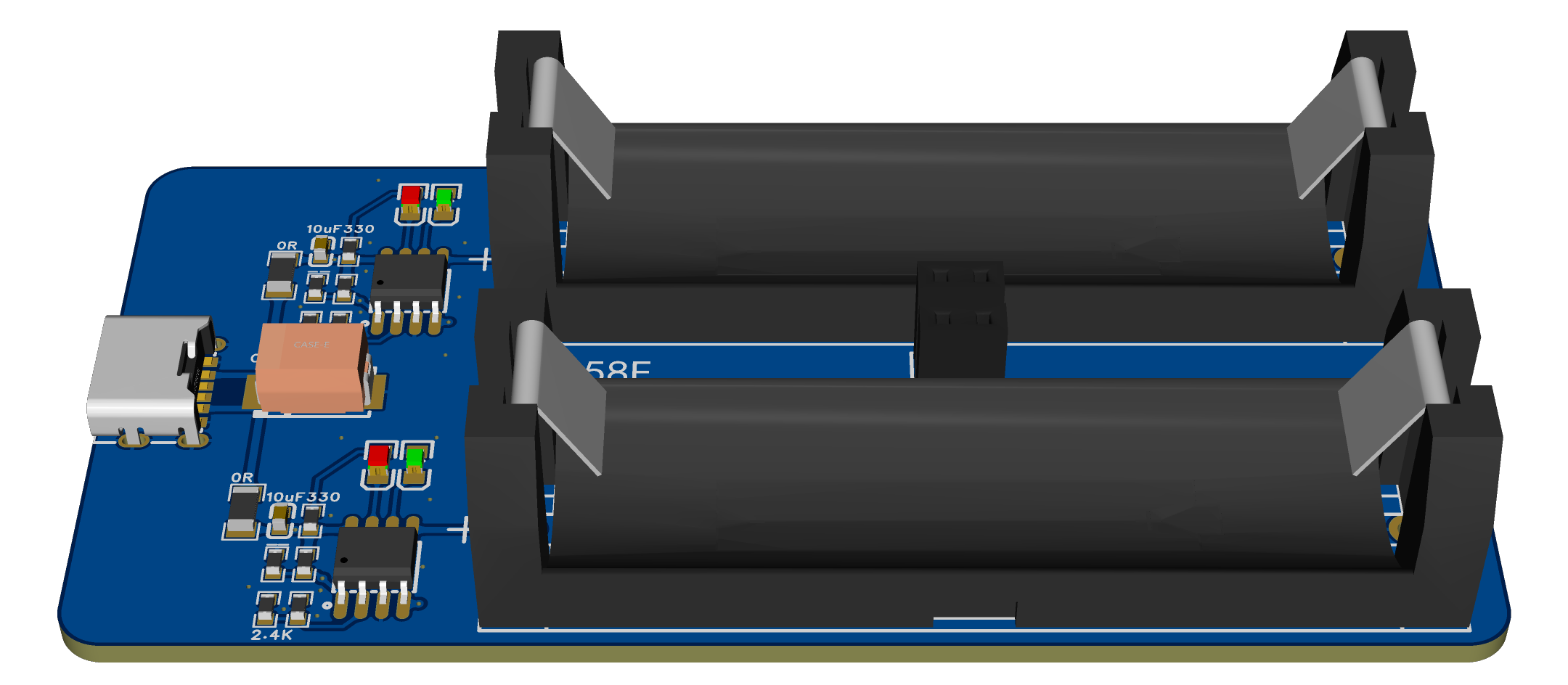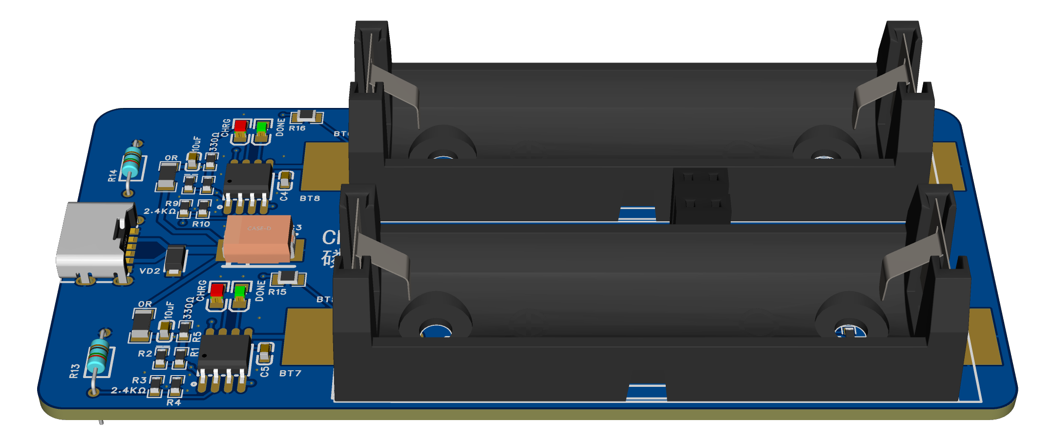 于是做了这个板子,可分别对两节磷酸铁锂电池充电,户外使用的话基本能满足需求。