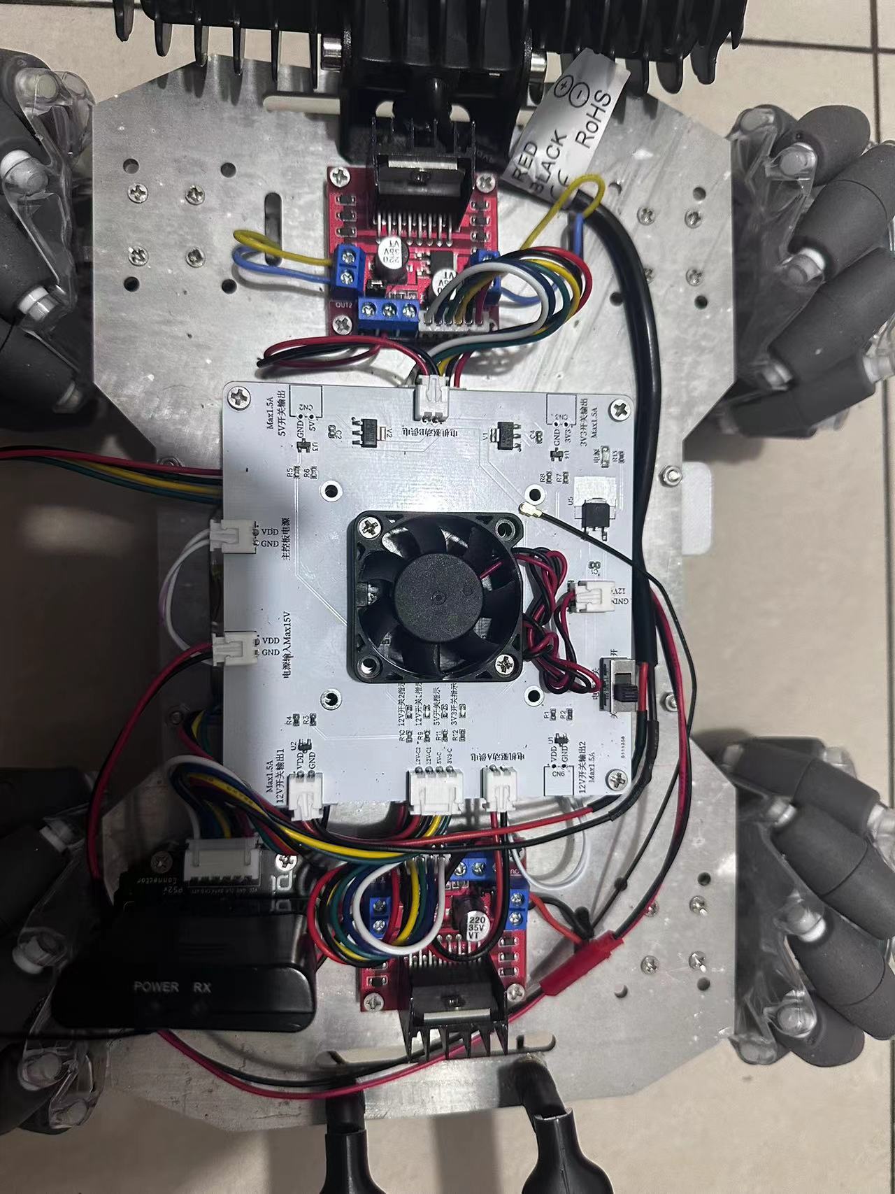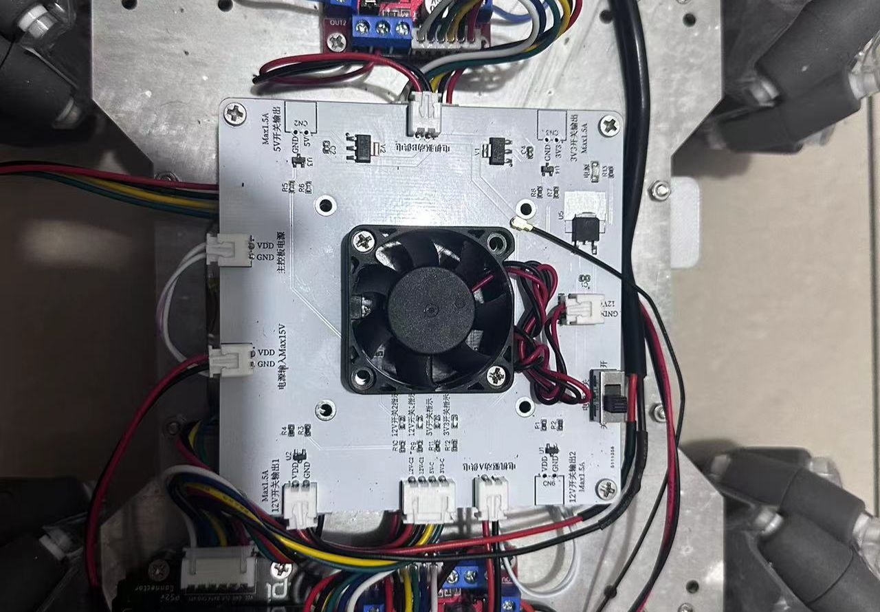 2S 8.4V电压输入,两路12V控制开关,单片机控制12V设备,电流最大1.5A,一路5V控制开关,电流最大1.5A,集成2S锂电可调升压电路,给主控板供电以及两路12V输出供电,集成12V散热风扇(40mm)